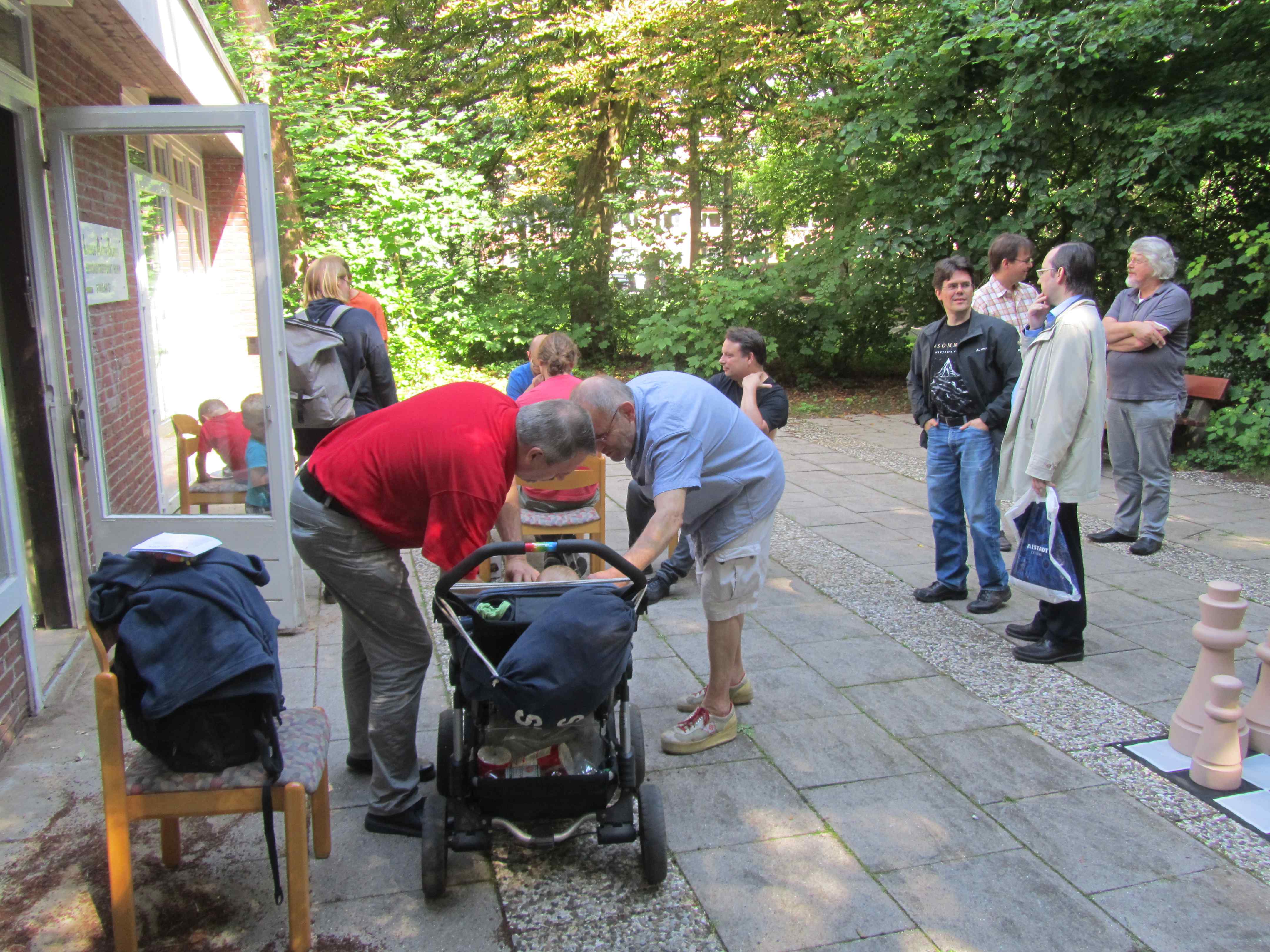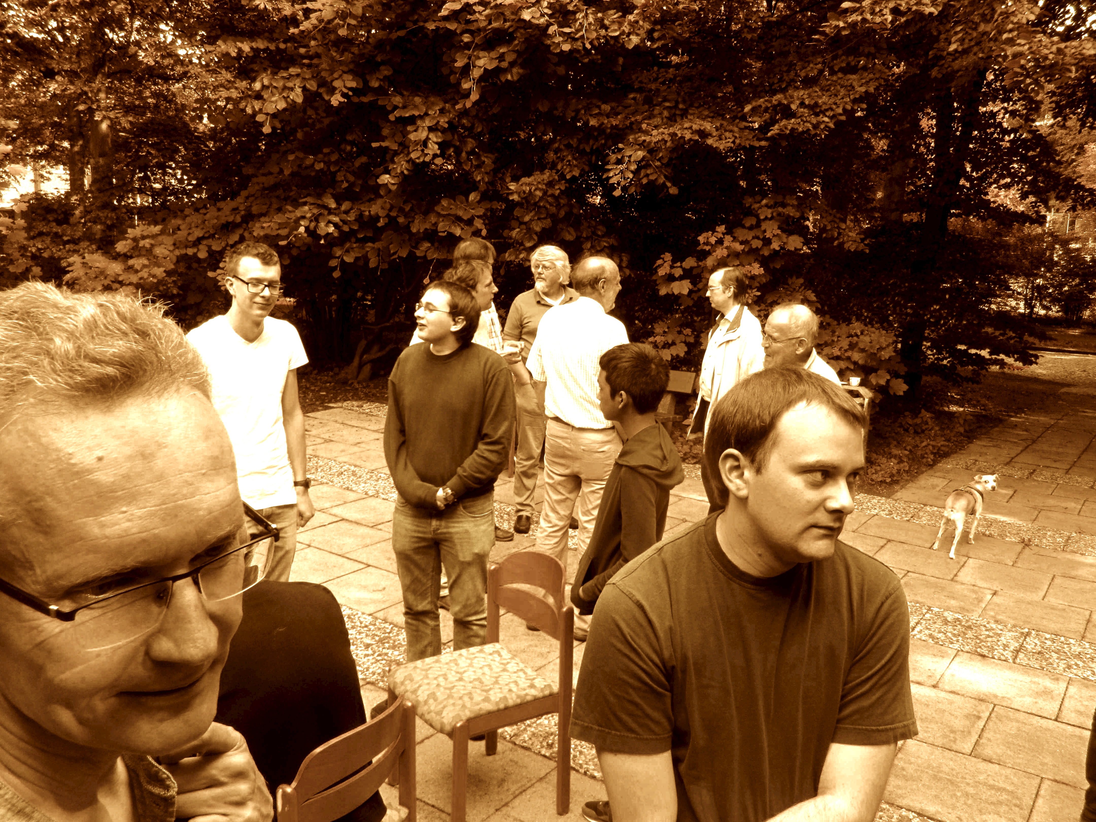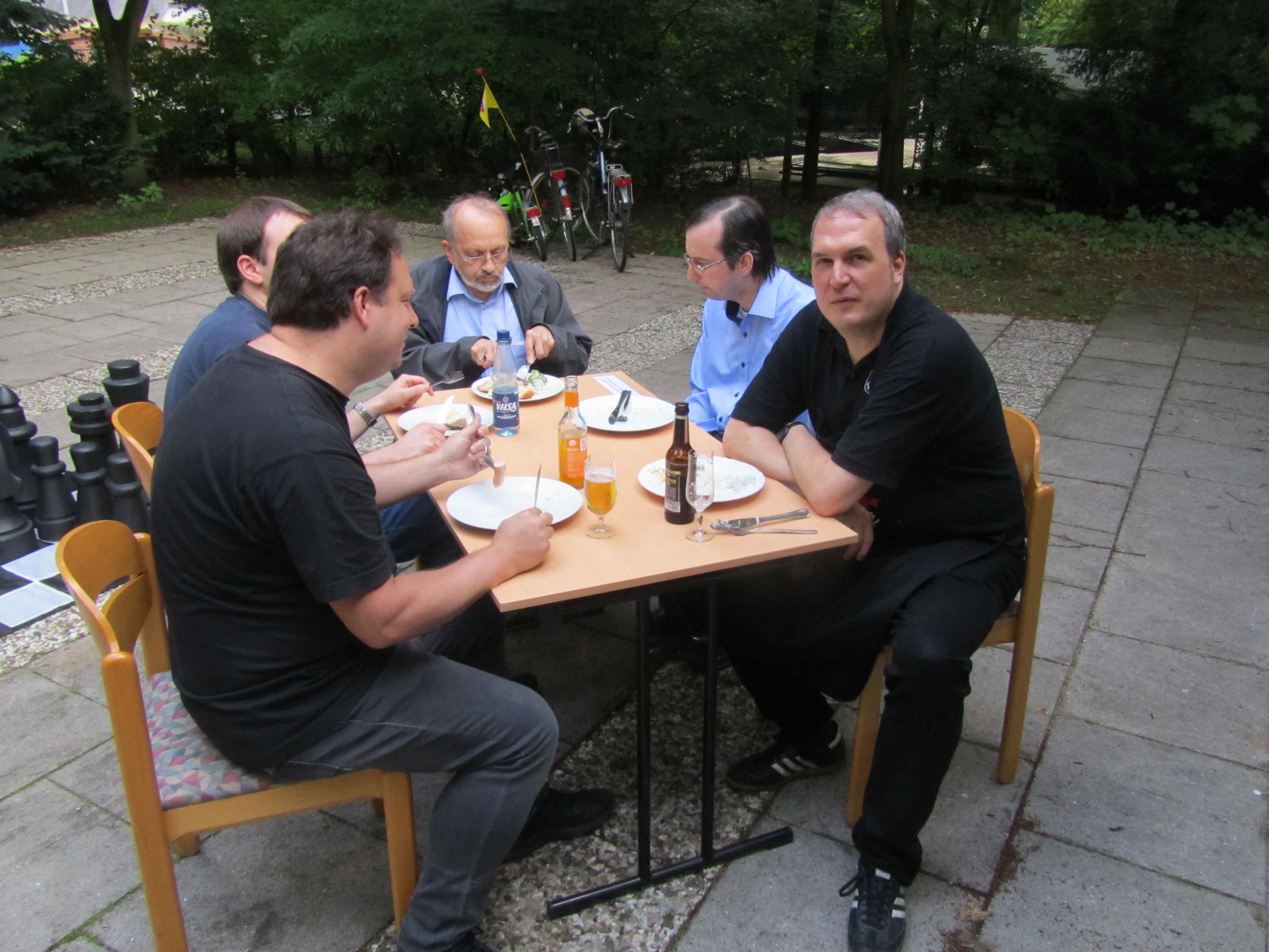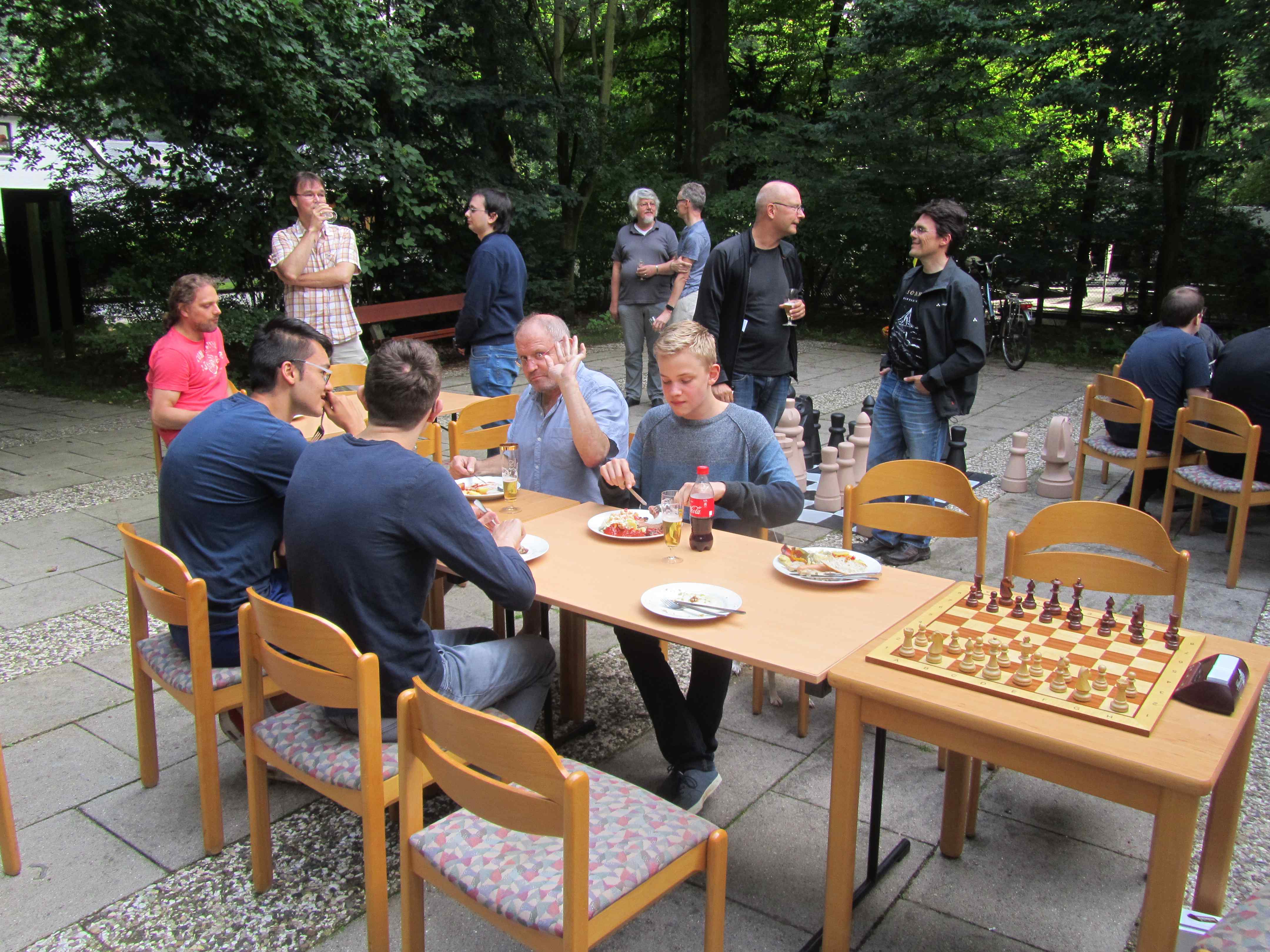 Schön wars mit Euch! Viele haben geäußert, dass es Spaß gemacht hat: zwischen Simultan- und Gartenschach tummelten sich alle Altersklassen, die ein Verein mit 40 Jahren Lebensgeschichte zu bieten hat: Jugendliche von MCG und CPG, Ehren- und Gründungsmitglieder und sogar der ganz junge Nachwuchs aus den nächsten Diogenesengenerationen. Sylvin Müller-Navarra, einer von noch 4 aktiven Gründern, die Ehrenmitglieder Michael Pommerening und Jörg Schulz und Werner Schulenburg, dessen Söhne inzwischen den SC Diogenes und auch diesen Jubiläumstag entscheidend mittragen – dies sind Namen, die für Martin Graffenberger, Ralf Hein und mich Erinnerungen an unsere Trainingsstunden wecken – es muss also länger her sein als man sich manchmal wünscht, dass dem SC Concordia ein Diogenes entsprang.