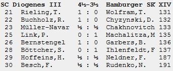 Am Ende gingen wir mit unseren Chancen gerade so großzügig um, dass es noch für 4,5 Punkte reichte. Besonders Michael (Link)s Partie sah druckvoll und schon gewonnen aus – aber die Zeitnotphase und seine derzeit geringe Spielpraxis führten zum „Gespenster sehen“, die wohl jeden schon mal am Brett verunsichert haben. Dagegen konnte Fabian (Besch) sehr ähnliche Rahmenbedingungen an Brett 8 gegen den nominell stärksten Gegner in Zeitnot zu einem wichtigen Remis überstehen, weil seine Partie nicht so spannend aber auch nicht so kompliziert angelegt war. Das war die Vorlage für Robert, kurz nach halb zwölf erneut technisch sauber seinen Endspielvorteil zu verwerten! Doch die letzte Bewegung machte – wie so oft – Sven, leider zur Aufgabe – gegen Felix Ihlenfeldt, Sohn unseres langjährigen Spielers Frank. Die DWZ-Differenz … Papperlapapp – diesmal war bestimmt eher entscheidend, dass unsere Gegner mit der bisher ältesten Mischung (fast 30 Jahre, gegenüber sonst zarten Anfang 20) auf unsere knackfrische U50-Rasselbande traf, wo wir sonst üblicherweise das Seniorenklassenalter (Ü55) aufweisen … dass das Diogenes mal passieren würde!?! Und ob man das in Anbetracht von DS-GVO überhaupt noch schreiben darf?!? Kopfschüttel!