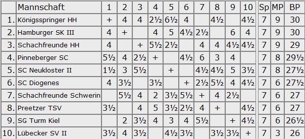 Die Oberliga ist dieses Jahr so eng zusammen, wie ich es noch nie gesehen habe. Der Tabellenerste, Königsspringer, hat 9:5 Mannschafts- und 30:26 Brettpunkte. Der Vorletzte, Turm Kiel, hat 6:8 Mannschafts- und 26,5:29,5 Brettpunkte!