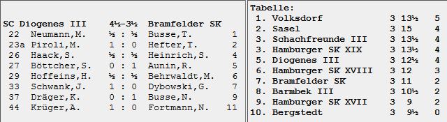 Wie schon bei den Allermeisten angekommen ist, werden in der Oberliga und Landesliga immer wieder Ersatzspieler angefordert, die dann für Mannschaft 3 und 4 gesperrt sind, was teils durch nicht vorhersehbare Lebenssituationen zustande kommt. Vorhersehbar und dennoch unplanbar ist die jährliche Grippewelle, die im aktuellen richtungsweisenden Kampf gegen Bramfeld zu ungewöhnlichen Szenen führte: unser neuer Spieler Michele staunte nicht schlecht über schon wieder unbekannte Gesichter im eigenen Team – Stefan H ist nach langwiweriger Geschichte dem Krankenbett entkommen und war zum ersten Mal dabei in dieser Saison. Dafür erwischte die Grippewelle übers Wochenende gleich 3 andere Mitspieler, die dann kurzfristig eigentlich nicht mehr ersetzt werden konnten, bevor Ersatzmann Klaus zu dem kürzlich aus Berlin zurückgekehrten Alex Kontakt aufnahm, der den schönen Büroabend gegen ein Comeback nach 2 Jahren tauschte, nicht ohne mit einer Belohnungsgerstenkaltschale zu einer erfolgreichen Kurzpartie gelockt worden zu sein … Ungewöhnlich war auch der Einsatz des frisch für die DSAM-Endrunde qualifizierten Johann, der schon lange in der Landesliga festgespielt ist aber in Runde 3 nicht eingesetzt wurde, um (?) nun einen sehr entscheidenen (und souverän im Übergang in ein gewonnenes Endspiel herausgespielten) Sieg einzufahren. So wurden nach 3 Runden schon 15 Spieler*innen eingesetzt! Ich kann nur hoffen, dass dies nicht (wieder) in zuvielen Kampflosen endet, wenn die möglichen Ersatzspielereinsätze zur Neige gehen.