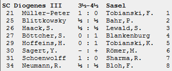 Ansonsten lief der Kampf normal: die Favoriten auf beiden Seiten setzten sich durch und die etwa gleich Starken remisierten, Sasel konnte also den DWZ-Vorsprung in einen knappen Sieg ummünzen. So gesehen sind die nun auf den ersten Blick vielleicht enttäuschenden 5:7 Punkte normal, denn wir gingen in der sehr ausgeglichenen Bezirksliga bisher nur einmal als DWZ-Favorit in einen Kampf.