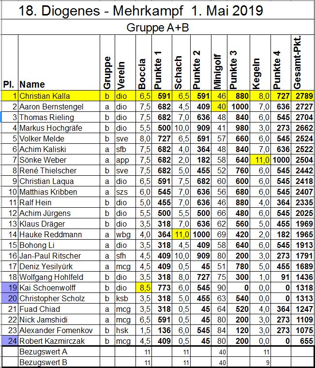 Gestern konnte er durch einen Endspurt im Kegelturnier seine überdurchschnittliche Ausbeute in den anderen 3 Disziplinen krönen und ist damit in der 18. Auflage ein 7. neuer Sieger! Am Ende war alles genauso knapp wie sonst beim abschließenden Skat – auch das nun dafür eingestzte Kegeln (bisher nur 2008 einmalig probiert) würfelte auch nochmal kräftig die Plätze durcheinander. Vorher sah es nach einem weiteren Durchmarsch des Rekordsiegers Markus aus (schon 5 Titel).