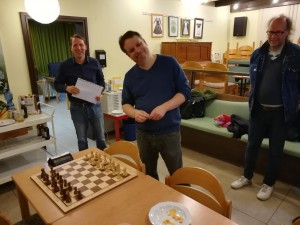 Martin, Markus und Laqui hatten alle 8,5/10. Martin hatte aber durch seinen Sieg gegen Laqui die beste Wertung und durfte sich deshalb als Sieger des „Markus dem sein 50. Geburtstag Blitzturniers“ krönen lassen!
