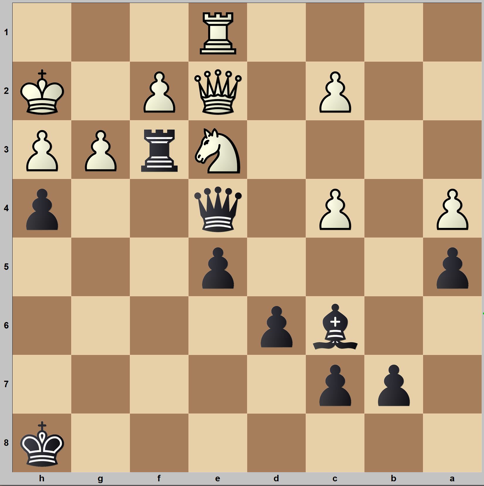 Schwarz steht klar auf Gewinn. Meine Lösung ging so: 1…. hxg3+ (mindestens +5 wie einige andere Züge auch). 2. fxg3 Txe3 3. Dh5+ Ist es Dauerschach? Da wir beide nur 1-2 Minuten auf der Uhr hatten (plus 30s / Zug), hatte ich entschieden: hoffentlich nicht?! Mein Gegner war vom Partieverlauf etwas pessimistisch geworden: 2… Kg7 3.Dg5+ Kf7 4.Tf1+?? Tf3 -+ Er hätte es wenigstens versuchen sollen und feststellen, dass der schwarze König zwar irgendwann den Läufer zum Schutz dazu holt – dann aber auf einem dunklen Feld steht, so dass nach Dg5+ der Te3 futsch ist.