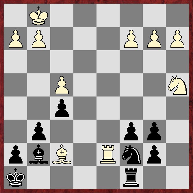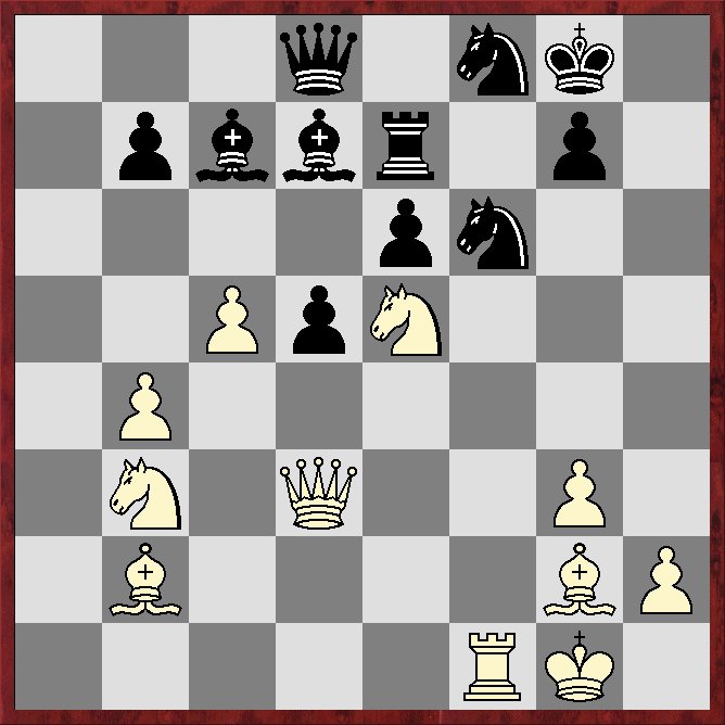 25. Sg6 Tf7 26.S:f8 D:f8 war schon suboptimal, und auch 27.Dg6 b6 28. Lc3 bc 29. bc waren nicht optimal, doch 29. …La4 30. L:f6 L:b3 (T:f7 führt Schwarz ins bessere Endspiel) lieferte noch die Chance auf Dauerschach. Doch statt L:g7 warf ich mit 31.Ld4 e5 32. Lf2.